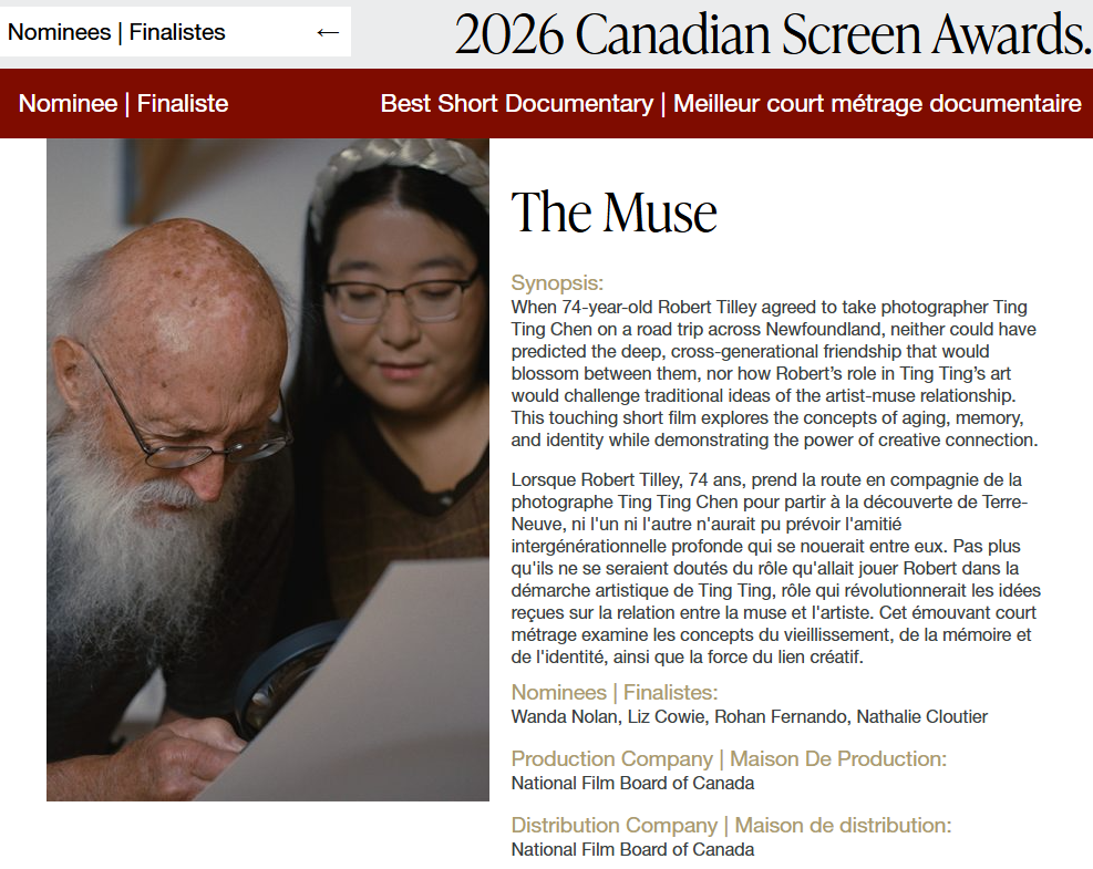 The Muse has been nominated for Best Short Documentary at the Canadian Screen Awards.